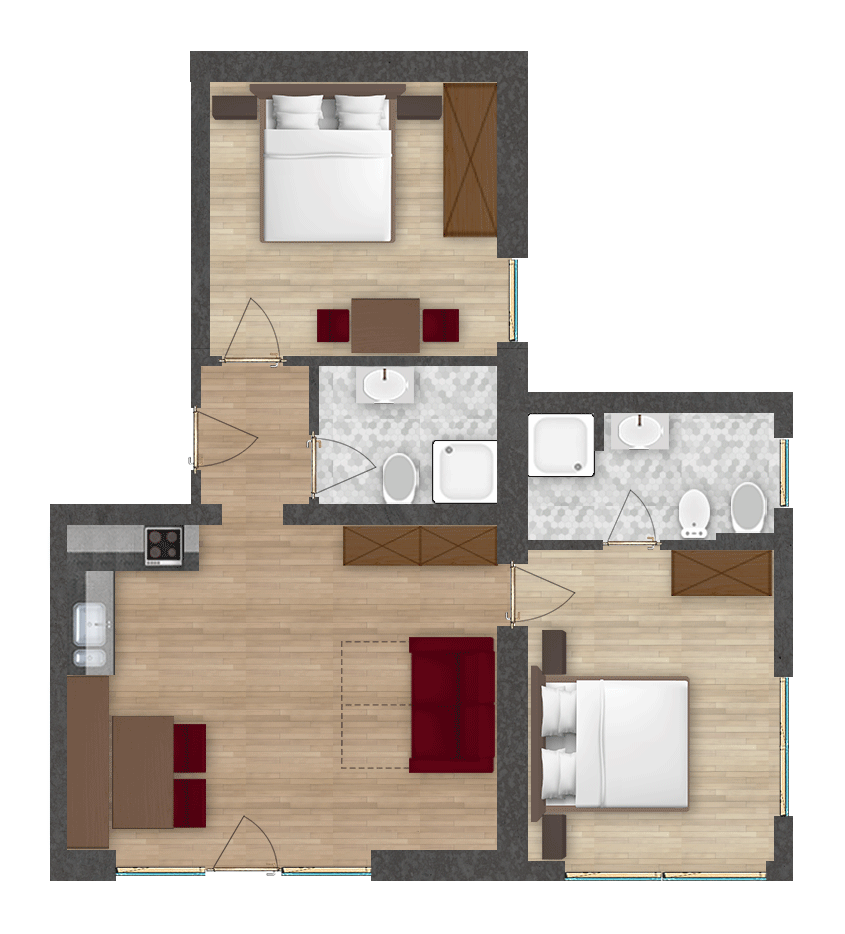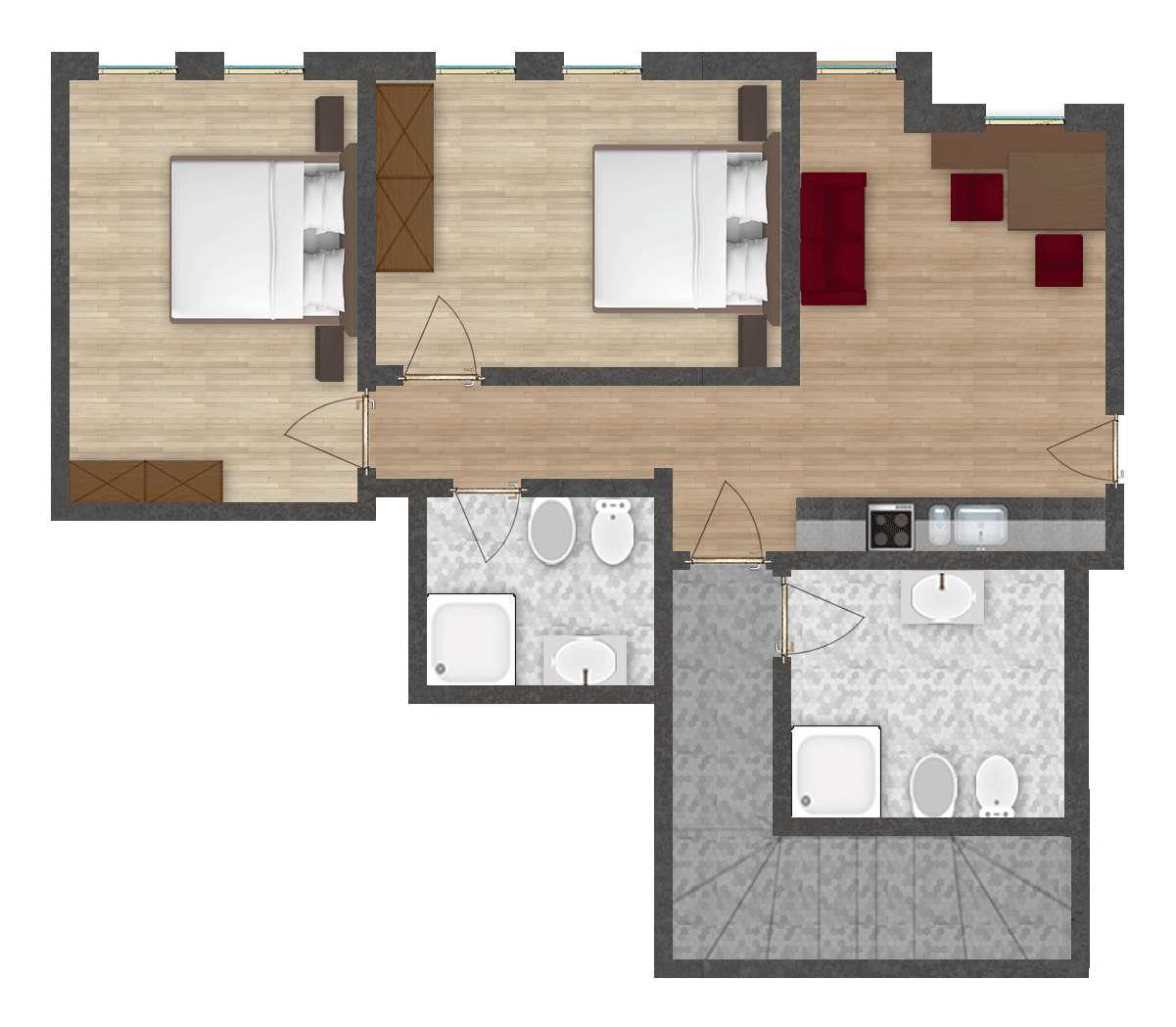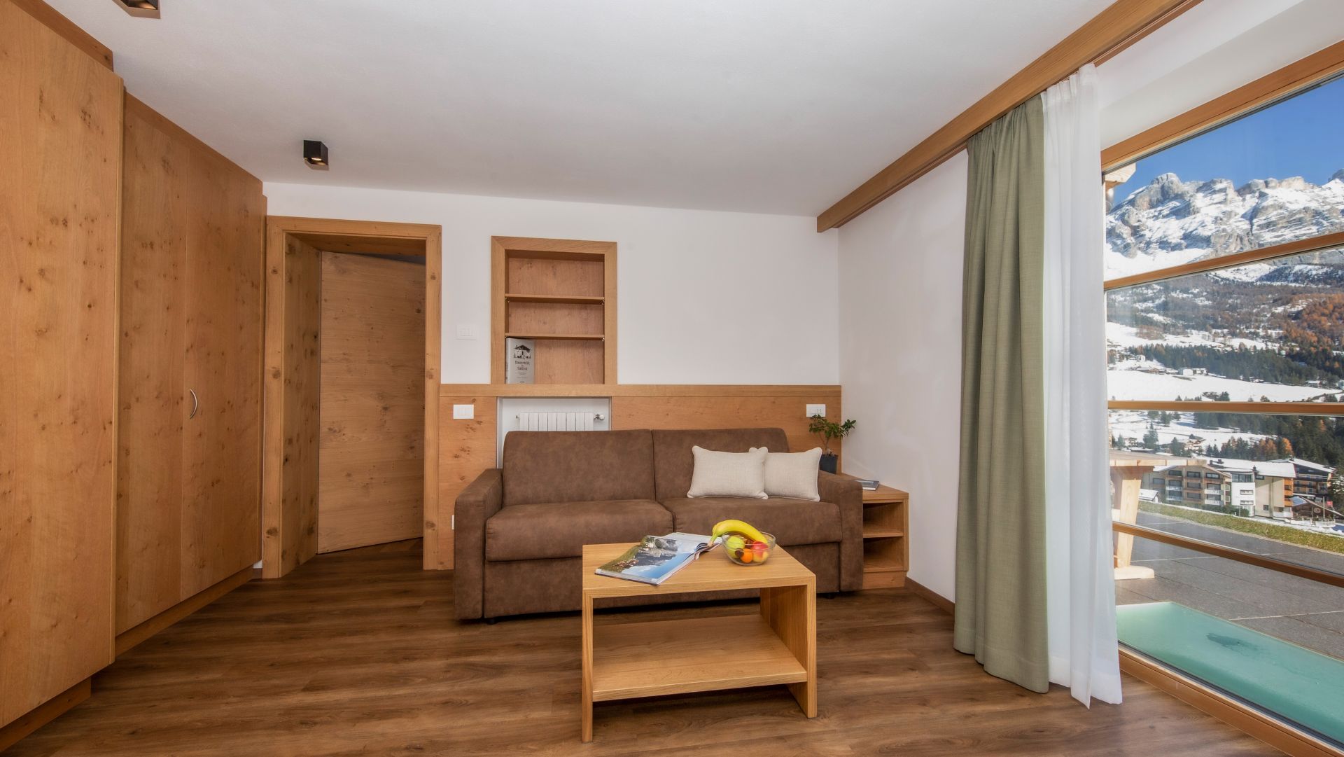 La sistemazione ideale per famiglie numerose! Si compone infatti di 2 stanze matrimoniali con possibilità di aggiungere un terzo letto in una delle due stanze, due bagni. La zona giorno offre una cucina con soggiorno molto spazioso, con comodo divano letto matrimoniale. Su richiesta, è possibile collegare una terza stanza matrimoniale con bagno privato. L’appartamento si trova al piano terra e si affaccia sull’ampio prato soleggiato con vista incantevole verso Sasso S. Croce, La Varella, Conturines ed il Piz La Villa con la famosa pista “Gran Risa”.