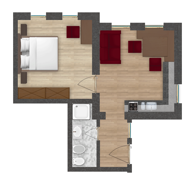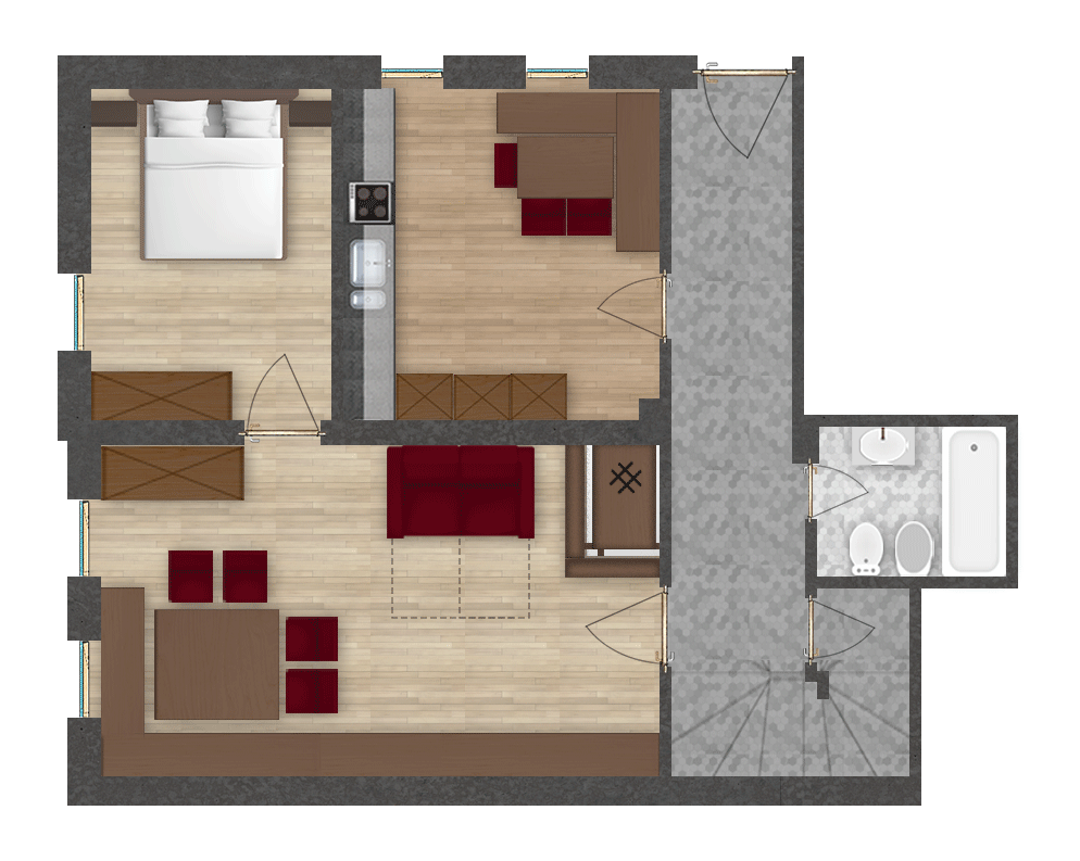 Ubicato al piano terra, l’appartamento La Stüa sorprende per i suoi ambienti generosi, come il soggiorno spazioso con divano letto doppio e, su richiesta, la possibilità di aggiungere un terzo letto. La cucina separata è molto spaziosa e completamente attrezzata e il bagno dispone di doccia e vasca. Oltre alla stanza matrimoniale, c’è la possibilità di aggiungere una stanza doppia con bagno privato al piano superiore, raggiungibile da scala interna.