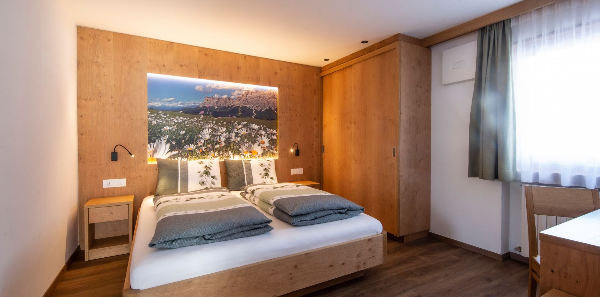 Scopri gli appartamenti Edelweiss, Alpenrose e La Stüa, situati nella nostra casa Apartments Picenin al n. 57, affacciati verso il massiccio della Gardenaccia.